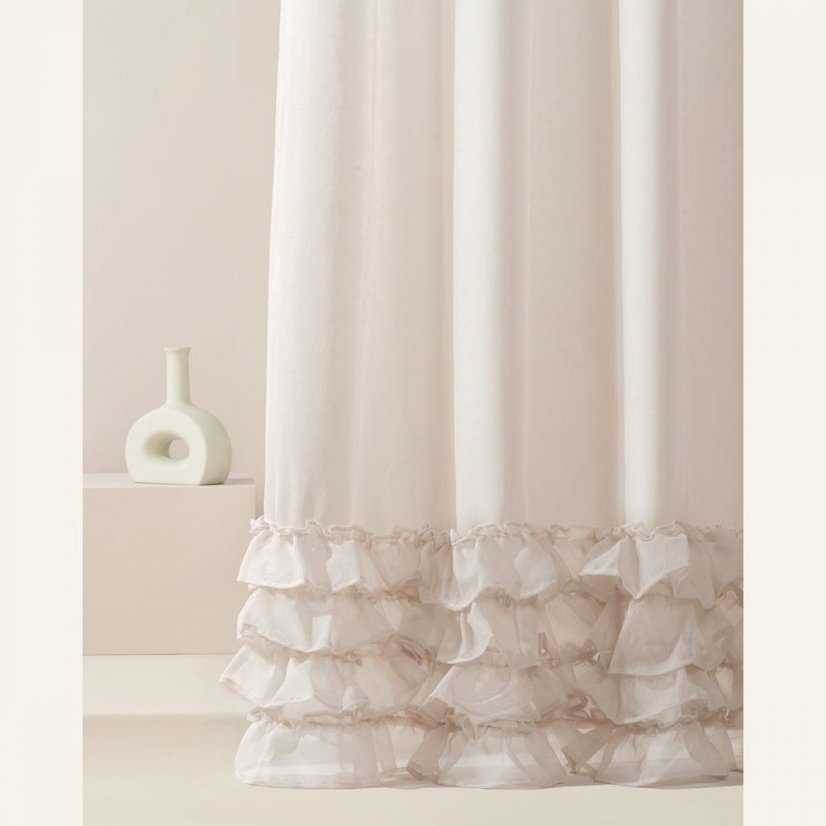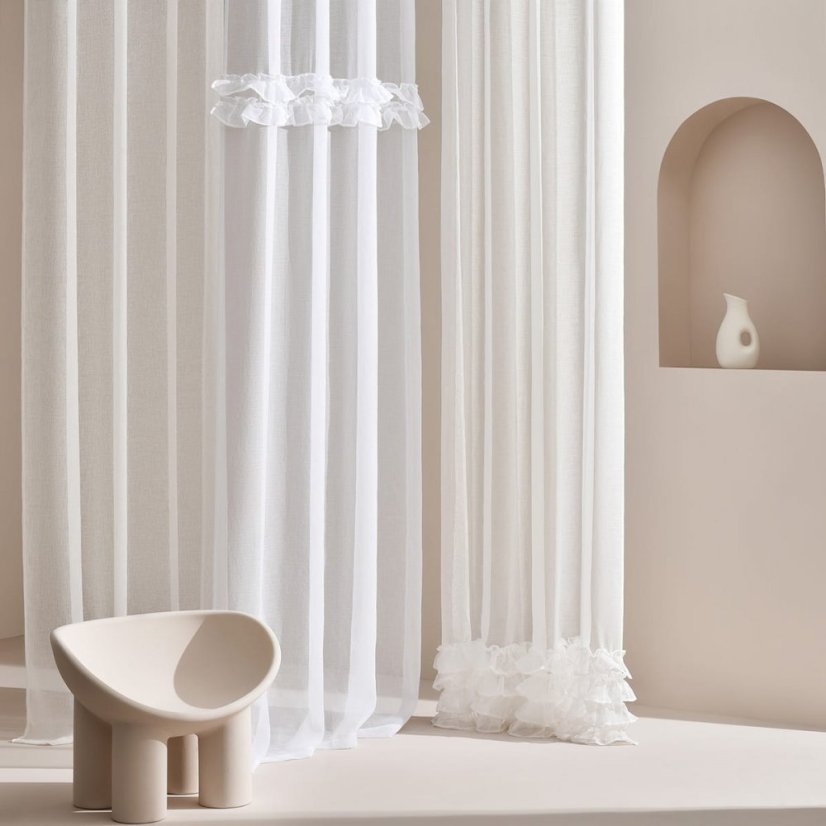 Záclona jemnej farby s kompozíciou volánu, zmyselne zveľadí čaro Vášho interiéru. Na tomto modeli stojí za povšimnutie najmä kvalitná látka, ktorá je príjemná na dotyk. Vďaka ľahkej a vzdušnej látke jemne prekryje okno a vnesie do interiéru veľa svetla. Záclona vytvára efekt jemných, mäkkých vĺn. Kovové priechodky zaisťujú jednoduchú inštaláciu na akúkoľvek záclonovú tyč. Objednajte si a uvidíte, aká je jedinečná!