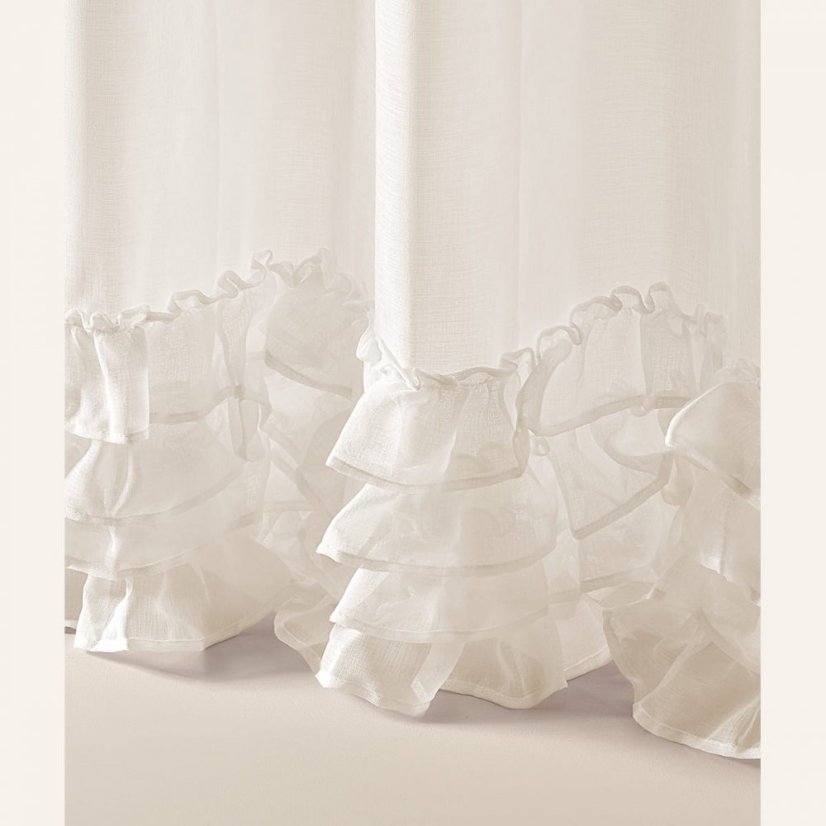Záclona jemnej farby s kompozíciou volánu, zmyselne zveľadí čaro Vášho interiéru. Na tomto modeli stojí za povšimnutie najmä kvalitná látka, ktorá je príjemná na dotyk. Vďaka ľahkej a vzdušnej látke jemne prekryje okno a vnesie do interiéru veľa svetla. Záclona vytvára efekt jemných, mäkkých vĺn. Kovové priechodky zaisťujú jednoduchú inštaláciu na akúkoľvek záclonovú tyč. Objednajte si a uvidíte, aká je jedinečná!