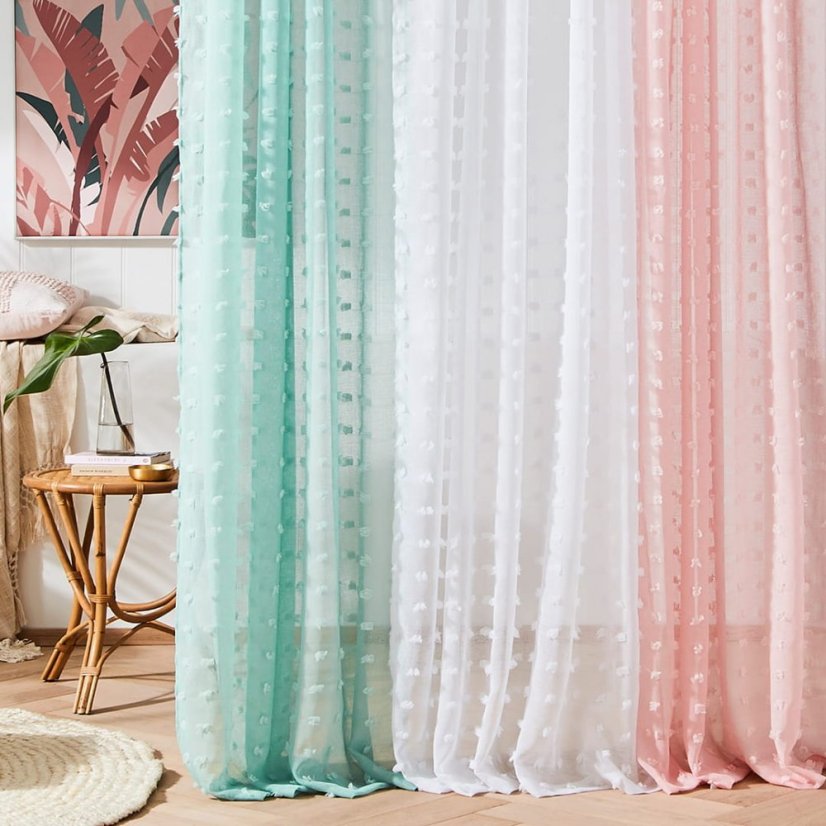 Majstrovsky zahreje domáci priestor a vytvorí okennú dekoráciu ľahkú ako hmla! Záves posypaný sofistikovanými brmbolcami vnáša do interiéru nádych elegancie. Záves bol vyrobený z hladkej a matnej látky.Kovové priechodky zaisťujú jednoduchú inštaláciu na akúkoľvek záclonovú tyč. Po zavesení na tyč sa krásne aranžuje a vytvára efekt jemných a zmyselných vĺn.